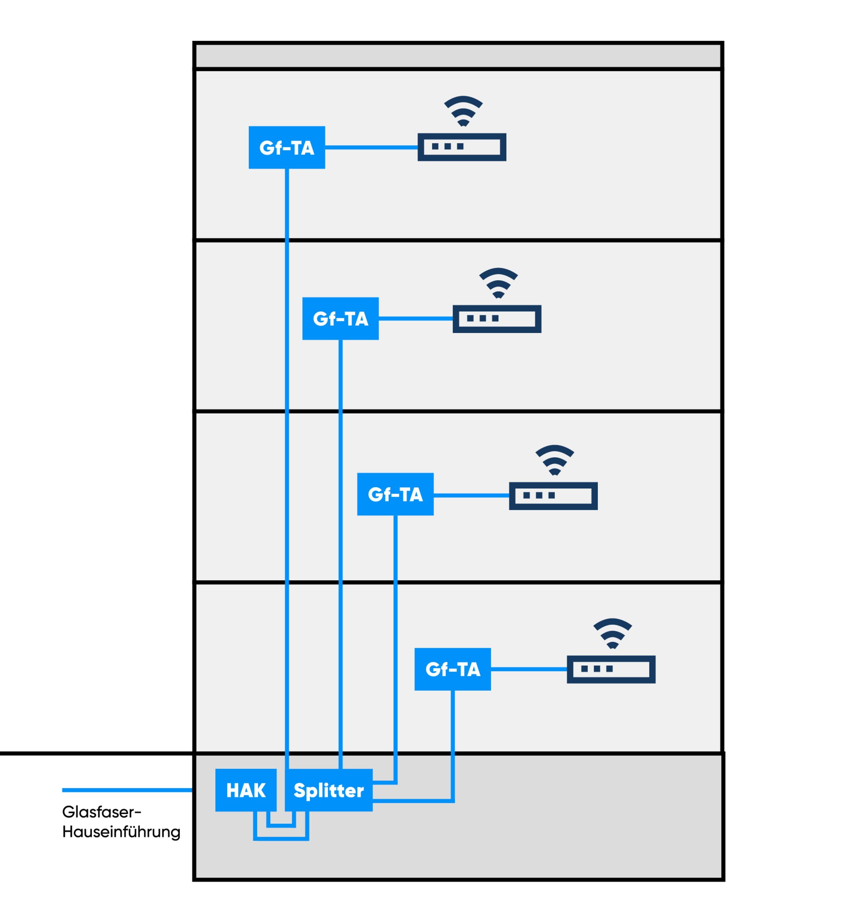 - Pro Wohneinheit ist ein Leitungsweg zwischen HAK/Splitter und Gf-TA erforderlich.