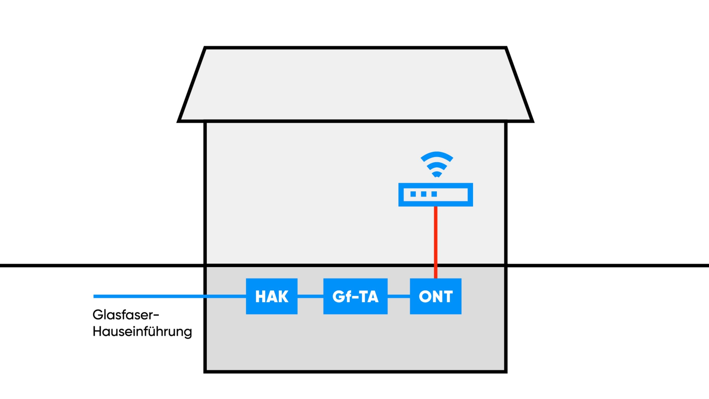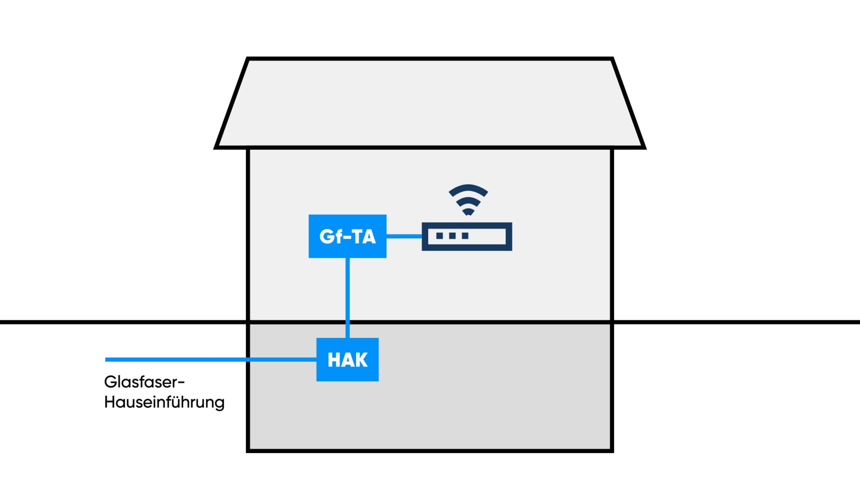 - Vorbereitung des Leitungsweges durch den Eigentümer zwischen Hausanschlusskasten (HAK) und Glasfaser-Dose (Gf-TA) notwendig.