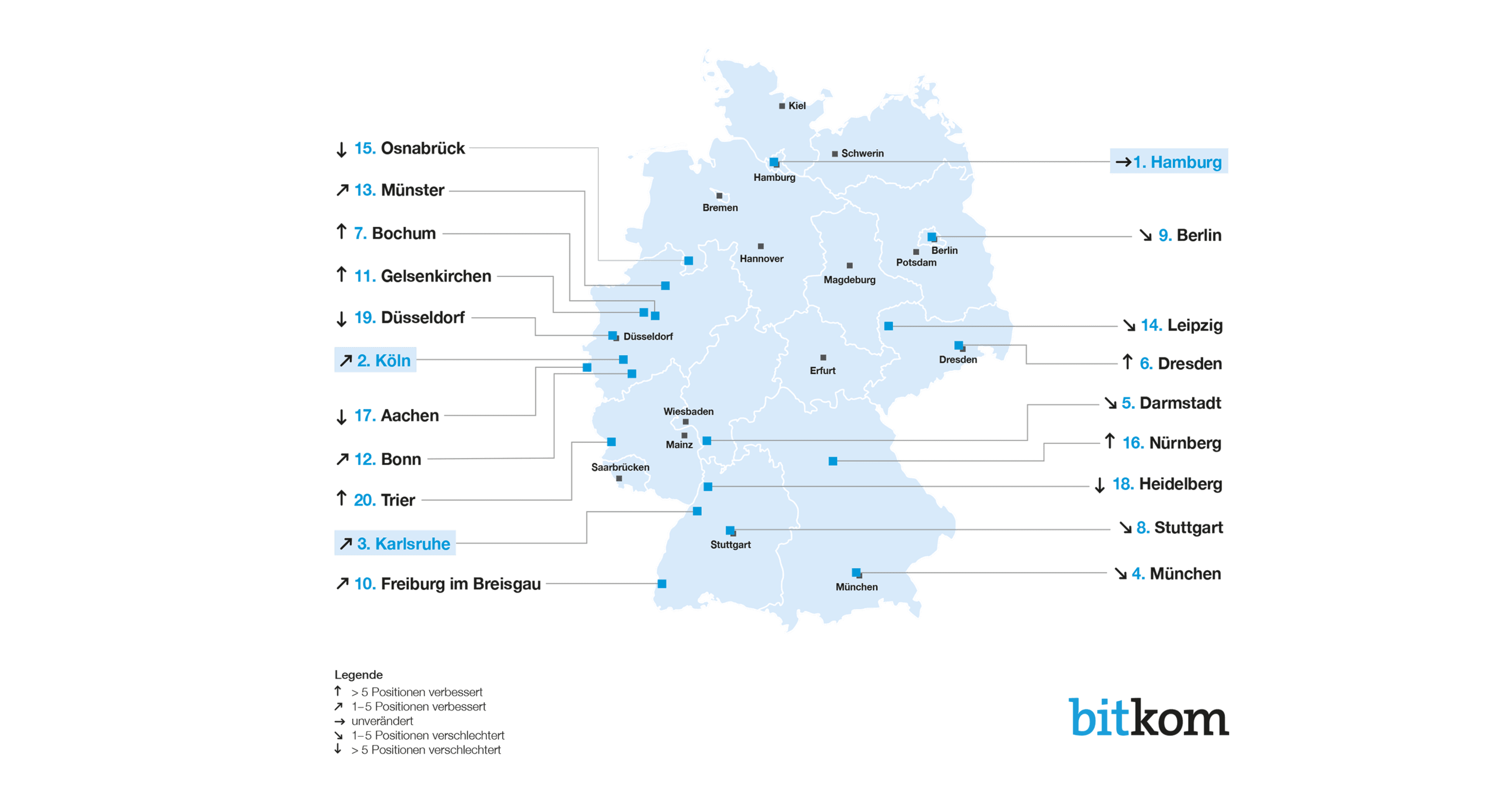 Auch im Smart City Index, den der Digitalverband Bitkom 2021 zum dritten Mal erhoben hat, schneidet Köln gut ab. Nach einem dritten Platz im Vorjahr rückt die Domstadt souverän auf Platz 2 vor und hebt sich von einem dicht gedrängten Verfolgerfeld ab. Hamburg verteidigt den ersten Platz. „Der Smart City Index macht verschiedene Trends bei der Digitalisierung der deutschen Großstädte deutlich“, sagt Bitkom-Präsident Achim Berg. Besonders gut schnitt Köln in den Bewertungskategorien „IT und Kommunikation“ sowie „Gesellschaft“ ab.